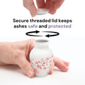 A threaded lid closes with a gentle twist to keep ashes secure, and the felt-covered base rests softly on any shelf, mantle, or columbarium niche. The smooth finish wipes clean with ease, and every urn arrives in a giftable box with a velour storage bag for added protection and care.