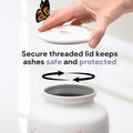 A threaded lid closes with a gentle twist to keep ashes secure, and the felt-covered base rests softly on any shelf, mantle, or columbarium niche. The smooth finish wipes clean with ease, and every urn arrives in a giftable box with a velour storage bag for added protection and care.