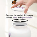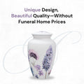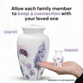 Our Soft Violet cremation urn surrounds memories with calm, its 360° floral design inviting reflection from every angle. Hand-crafted metal gives reassuring strength, while a quiet twist of the threaded lid keeps ashes secure and the felt-covered base rests gently on any shelf, mantle, or columbarium niche.