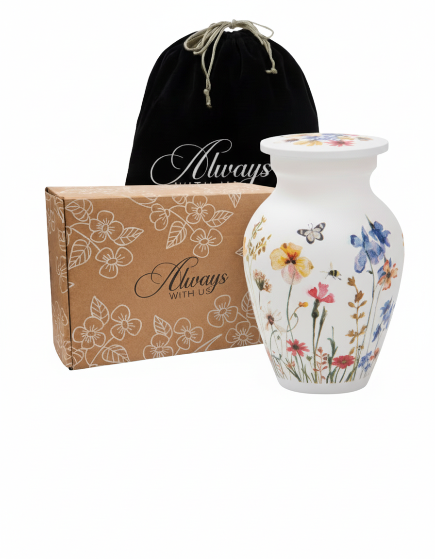 A threaded lid closes with a gentle twist to keep ashes secure, and the felt-covered base rests softly on any shelf, mantle, or columbarium niche. The smooth finish wipes clean with ease, and every urn arrives in a giftable box with a velour storage bag for added protection and care.